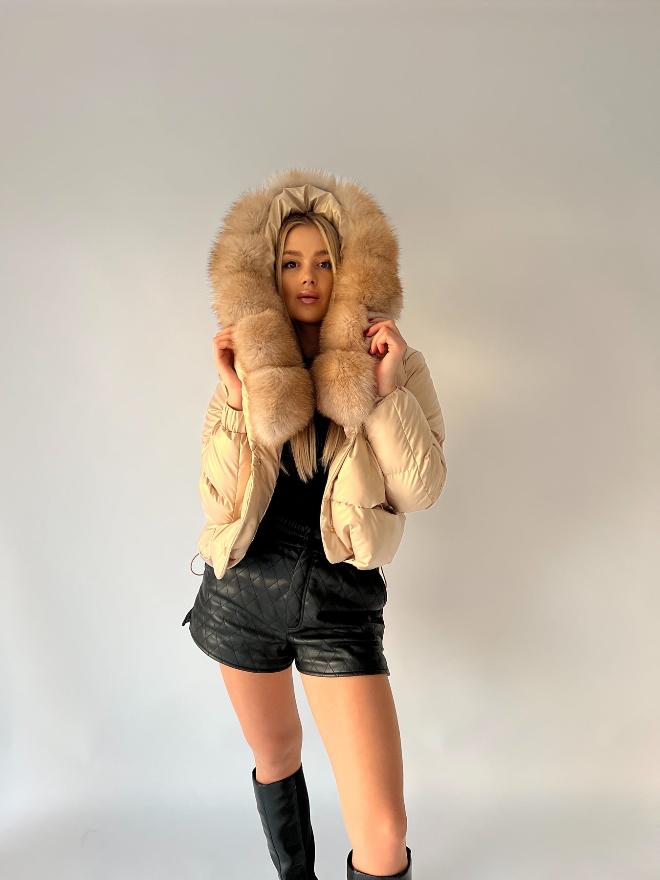 Perleťová bunda je dokonale prispôsobivá vďaka sťahovacej gumičke, ktorá sa tiahne po celom obvode vnútornej strany. Celá je podšitá luxusnou látkou, takže pôsobí elegantne aj vtedy, keď si ju vyzlečiete. Rukávy sú ukončené praktickou gumičkou na zápästí a nechýbajú ani dve vrecká. Súčasťou bundy je odnímateľná kožušina aj kapucňa, čo vám umožní prispôsobiť si ju podľa štýlu aj počasia.