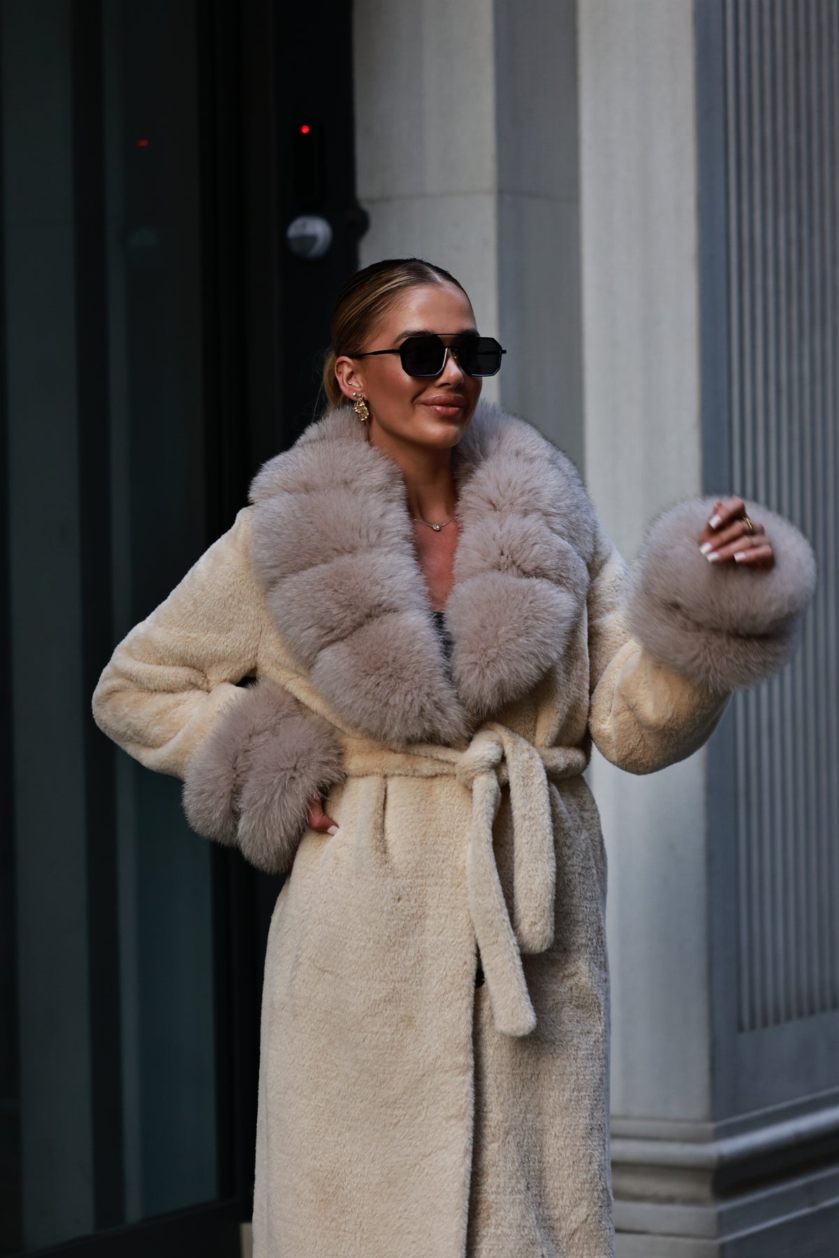 Dlhý kabát z alcantary je dostupný v piatich odtieňoch – béžová, biela, čierna, mliečna a kávová. Decentne zdobený líškou poskytuje výnimočné teplo a pohodlie. Kvalitná látka spolu s detailmi pri krku a rukávoch spoľahlivo udržia teplo vo vnútri a zabránia prenikaniu chladu.