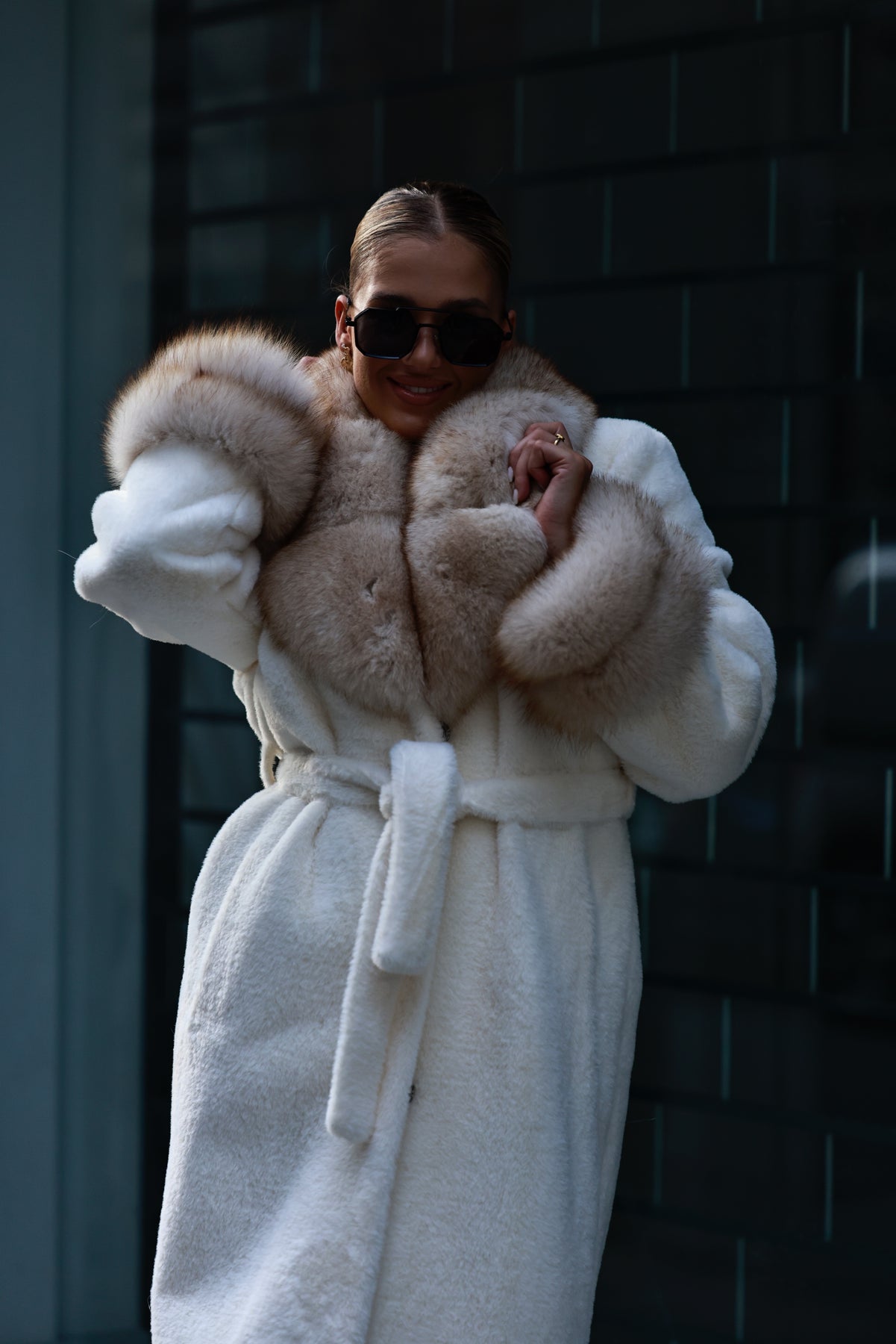 Dlhý kabát z alcantary je dostupný v piatich odtieňoch – béžová, biela, čierna, mliečna a kávová. Decentne zdobený líškou poskytuje výnimočné teplo a pohodlie. Kvalitná látka spolu s detailmi pri krku a rukávoch spoľahlivo udržia teplo vo vnútri a zabránia prenikaniu chladu.