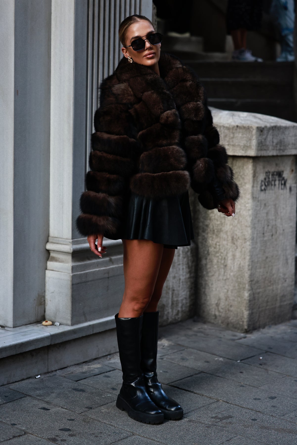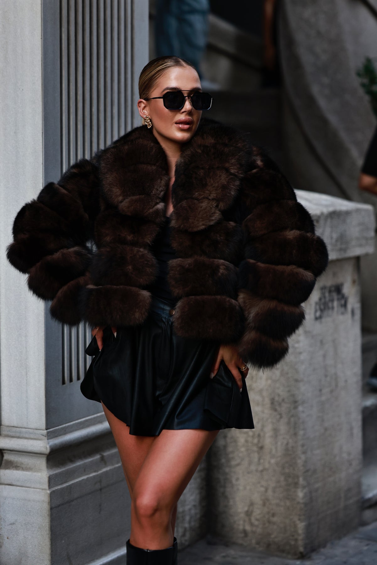 Kožuch Brownie (60 cm) je podšitý 100 % jahňacou kožou, ktorá zaručuje teplo a pohodlie. Má dokonalý odtieň hnedej prepojenej s čiernou, ktorý sa na svetle jemne mení a pôsobí luxusne. Dominantný golier plynule prechádza do celého kožucha, čím vytvára elegantný dizajn produktu.